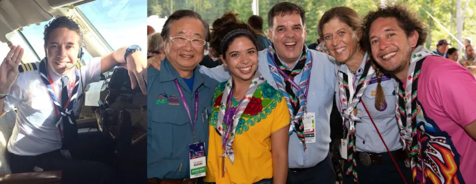 The photo here shows Leonardo in pilot's uniform on the left, as well as with a group of Baden-Powell Fellows at the BP Fellow Reception at the 24th World Scout Jamboree (right-hand side).